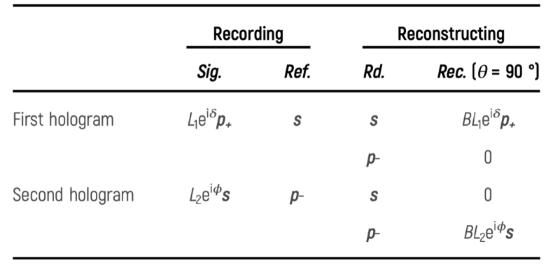 与以往的研究不同,本研究利用偏光全息术中的偏振正交可产生零再现的独特重建特征,使包含振幅、相位和偏振多维调制信息的全息数据能够同时存储并再现。基于张量偏光全息理论的计算结果(如表1 所示),利用两个相互正交的偏振光波,依次记录两个携带多维调制信息的全息图,我们可以在 90° 的特殊干涉角下实现两幅全息图之间的无串扰切换,其中每幅全息图都有三维调制的编码信息。