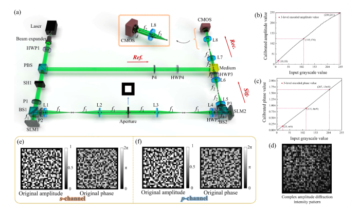 图1(a) 展示了该实验的光学装置示意图。振幅调制 SLM 和相位调制 SLM 的校准曲线分别如图1(b) 和 2(c) 所示。基于图1(b) 和图 1(c) 所示的三阶振幅和相位值,采用 30 × 30 的编码数据矩阵,过采样因子为 10,进行随机三阶复振幅数据编码。在图1(a) 中,透镜8的后焦平面处得到的光波进一步传播了 d=2mm 的距离,其目的是为了增强相位信息的清晰度,使深度学习能够更好地掌握其相位特征。通过 CMOS 传感器捕获了具有复杂振幅强度的衍射图,如图1(d) 所示。信号光路的偏振状态由半波片 3 (HWP3) 调节。同时,在参考光路中,偏振片 4 (P4) 和 HWP4 协同将出射光切换到不同的偏振通道:s 通道(由 s 偏振参考光照射)和 p 通道(由 p 偏振参考光照射)。图1(e) 和图1(f) 所示的原始振幅和相位图分别描述了 s 通道和 p 通道中记录的复振幅信息的分布。对于 s 通道,将图1(e) 所示的幅相分布图上传到各自的 SLM 上,然后通过 HWP3 将信号光的偏振状态调整为 p 偏振光。调制后的信号光具有三维不同信息特性,在偏振敏感介质中与相应参考光发生干涉记录,记录时间为 1 分钟。