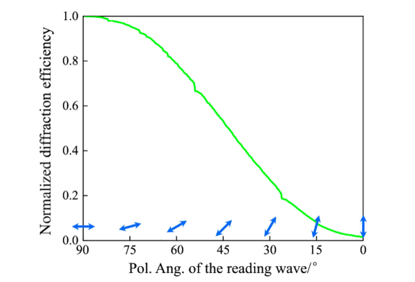 图2 衍射效率与读取光偏振态变化的关系,其中不同的偏振方向用双箭头符号表示