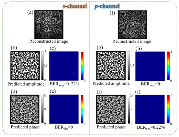 值得注意的是,我们通过该方法对重建的单幅偏振全息图的幅相信息进行了高精度重建,得到幅相误码率(BERamp 和 BERpha)均低于 0.5%,并保证了偏振状态下的完全正交消光。