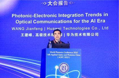 华为技术有限公司王建峰高级规划师以《人工智能时代光通信中的光电子集成趋势》为题,指出AI算力爆发催生算力网络需求,当下DCN光模块正朝更低功耗、更高带宽密度演进,通过硅光集成等技术破解传输瓶颈。 |