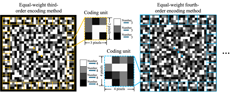 全息数据存储技术利用激光干涉原理,在光敏介质中以三维方式记录二维数据页,具有高存储容量、长寿命和快速数据传输速率等特点。然而,记录介质的非均匀衍射效率会导致重建图像能量分布失真,影响深度学习解码网络模型的训练性能,并导致传统阈值解码方法出现高误码率。 为解决这一问题,本文提出了一种定权多阶数据页编码方法,在编码阶段确保数据页实现均匀能量分布。在此基础上,进一步引入自适应同态滤波方法,基于定权数据页的均匀能量特性,降低重建图像能量分布的方差。随后,利用滤波后的数据集训练复振幅解码卷积神经网络,并在解码过程中利用已知定权编码信息缓解能量分布不均的影响。最终,该方法将复振幅振幅数据的误码率降低了60%以上。该数据页编码方法和自适应同态滤波为全息存储的进一步发展提供了有力支持,并具有跨领域应用潜力。 在研究中,首先设计了新型定权多阶数据页编码方案,确保单个数据页内能量分布均匀,且不同数据页的总能量一致。这种均匀能量分布作为先验知识,为后续图像处理和解码提供了支持。图1 为定权编码示意图,在最小编码单元(例如 4×4)中,每个灰度阶的像素数量固定(如每阶 4 个像素),通过区域比较解码方法排序像素灰度值进行分类,避免了强度混淆。编码容量计算显示,对于 4×4 四阶编码单元,有 63,063,000 种独特组合,编码率为 1.5625。实验中,选择四阶编码应用于振幅和相位数据页,最终编码率为 3.125。 |