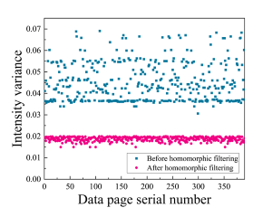 其次,引入自适应同态滤波技术,针对介质非均匀性引起的图像失真进行校正。该方法基于图像形成乘法模型,通过对数变换、傅里叶变换和高斯滤波器压缩动态范围并增强细节对比。同态滤波工作流程分离照明和反射成分,实现强度分布均匀化。针对不同数据页的能量包络差异,自适应机制以编码单元总能量方差作为评价指标(如图3),动态优化滤波参数。优化过程采用迭代扰动和概率接受,确保滤波失败避免。图4 显示,390 张重建图像的平均强度分布方差从 0.0454 降至 0.0187,能量包络更平滑。 |