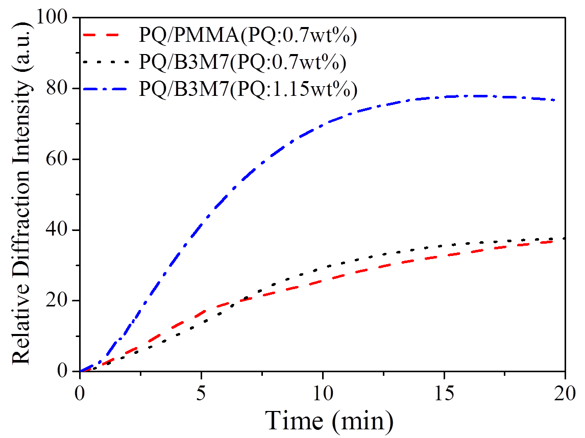 如图2和3所示,范凤兰同学通过引入共聚单体BzMA,提高了材料体系中光敏剂PQ的浓度,成功提高了材料的衍射效率和光诱导双折射值。