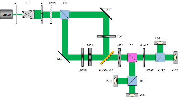 | 图3 线偏光读取实现忠实再现装置图。At:衰减片;BE:扩束镜;PBS:偏光分束镜; BS:分束棱镜;HWP:半波片;QWP:四分之一波片;SH:快门; A:光阑;M:反射镜;PM:功率计;PQ/PMMA:记录材料。 |