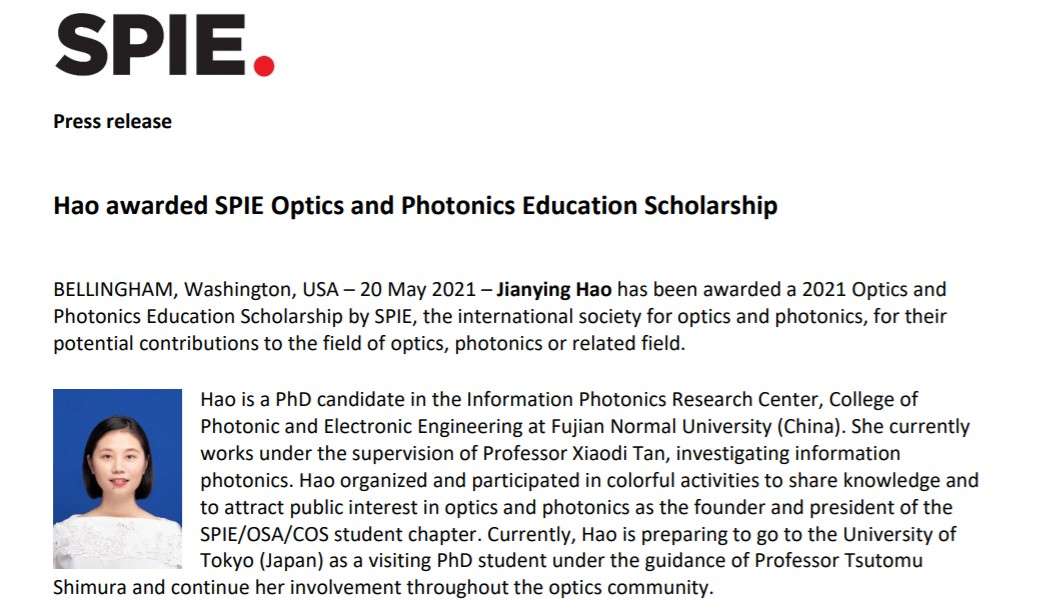 近日,2021年度国际光学工程学会光学与光子学教育奖学金(SPIE 2021 Optics and Photonics Education Scholarship)评选结果揭晓,福建师范大学光电与信息工程学院2019级博士研究生郝建颖荣获该奖项。