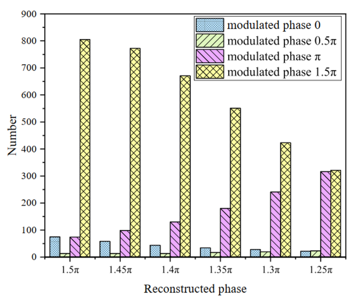 然后探索了传统降采样方法不准确的原因。图2 展示了重建相位为不同值时,记录相位分别为 0、π/2、π 和 3π/2 的个数。从图中可以看出,当重建相位为 1.45π 时,记录相位为 0、π/2、π 和 3π/2 的个数分别是 58、13、98 和 772。也就是说,记录相位并不一定是 1.5π,有可能是 0、π/2 或 π。另外可以看出,当重建相位的取值从 1.45π 变化到 1.25π 时,记录相位为 1.5π 的个数逐渐减小。也就是说,调制相位 1.5π 经过全息存储信道后转移成各个重建相位的概率是不一样的。因此,直接将相应区间中的重建相位无差别地判决为某个调制相位是不合适的,判决会造成一部分有用信息的丢失,进而影响降采样的准确性。