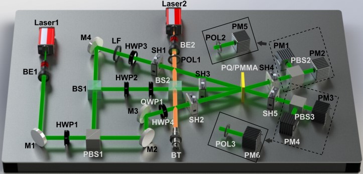 图2. 实验装置图。BE,扩束镜筒;M,反射镜;HWP,半波片;QWP,四分之一波片;PBS,偏振分束器;BS,分束器;LF,滤光片;POL,偏振片;SH,快门;PM,功率计;BT,光束终止器