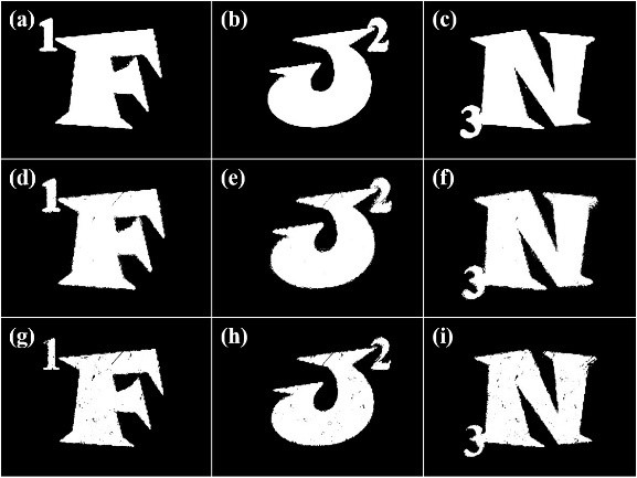 实验结果表明,通过改变读取参考光的偏振阵列,可以在同一记录点再现三幅独立的全息图。图3(a) - (c) 为 CMOS 相机直接采集的原始偏振全息图;图 3(d) - (f) 为原始偏振全息图透过材料后 CMOS 相机采集的光信号;图 3(g) - (i) 分别为相应的偏振编码 Q1、Q2 和 Q3 依次读取全息图的结果。尽管衍射效率非常低(小于 0.01%,仅在 nW 级范围)和一些背景噪声的存在,但仍然可以清楚地识别被记录的全息图。并且再现全息图和原始图像可以完全重叠。因此,这些实验结果与理论分析较为吻合。其验证了采用正交偏振编码方法的偏振复用设计的优良性能。 |