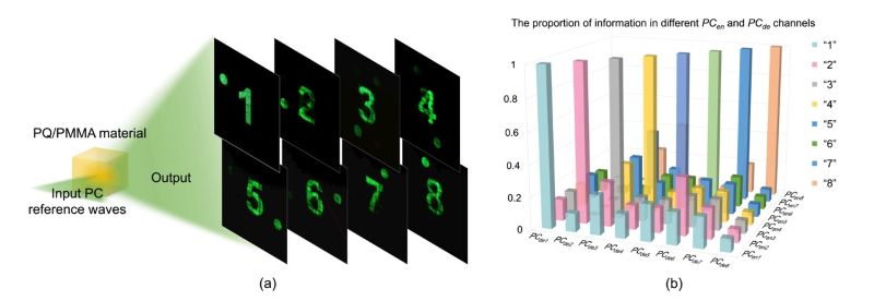 在本项工作中,我们充分利用了偏光全息在 90 度干涉夹角下具备正交零再现的特性,使用 OPOM4×8 的 8 组列向量作为偏振密钥。在先后记录了 8 幅全息图后,我们再利用这 8 组密钥进行读取,成功实现了多通道数字信息的检索(图2)与图像的动态显示(图3)。 |